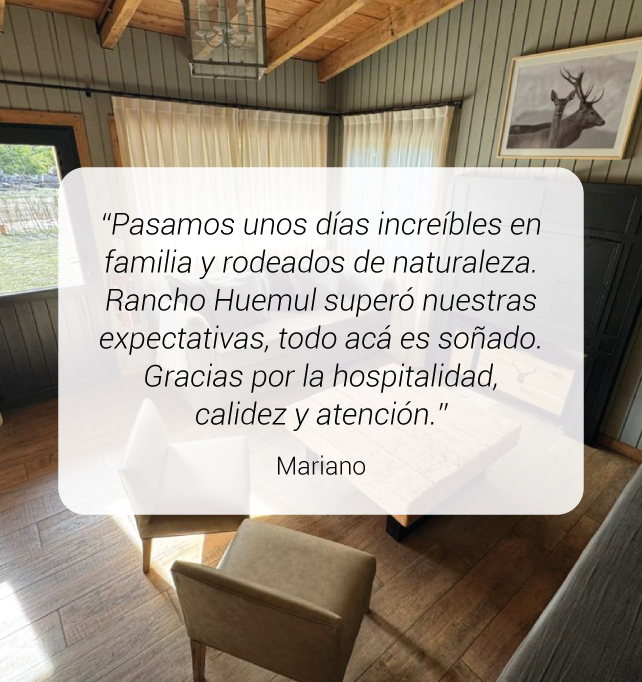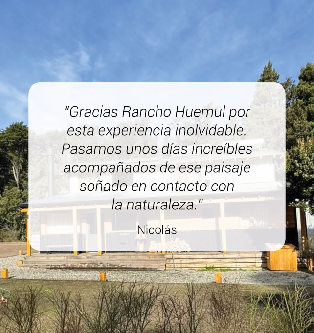 En Rancho Huemul vas a descubrir un lugar único e inolvidable: comodidad plena, naturaleza en estado puro y la libertad de diseñar tu propia aventura, siempre desde la calidez de tu cabaña en el bosque.